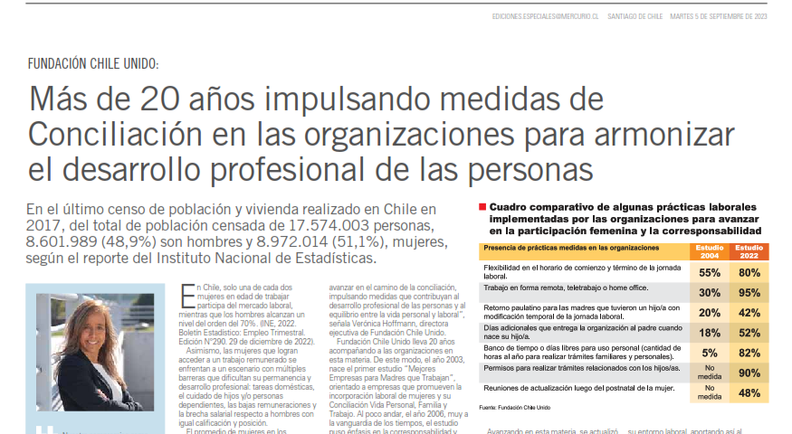 Verónica Hoffmann, Directora Ejecutiva de Fundación Chile Unido precisa: “Nuestro compromiso como Fundación Chile Unido, desde el 2003, ha sido acompañar a las organizaciones para avanzar en el camino de la Conciliación, impulsando medidas que contribuyan al desarrollo profesional de las personas y al equilibrio entre la vida personal y laboral”.