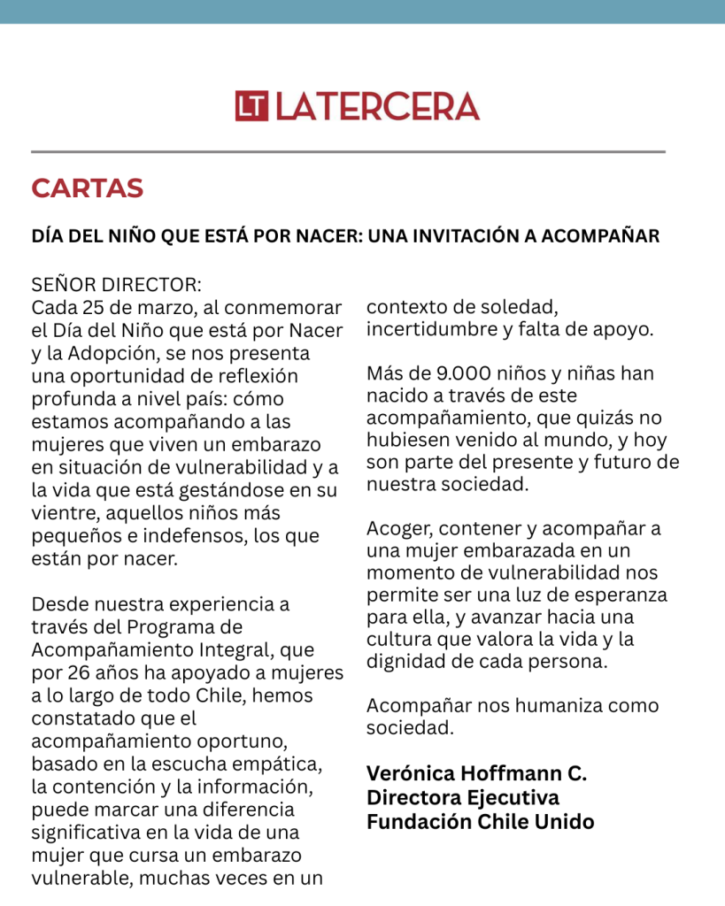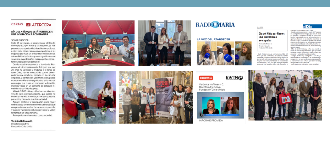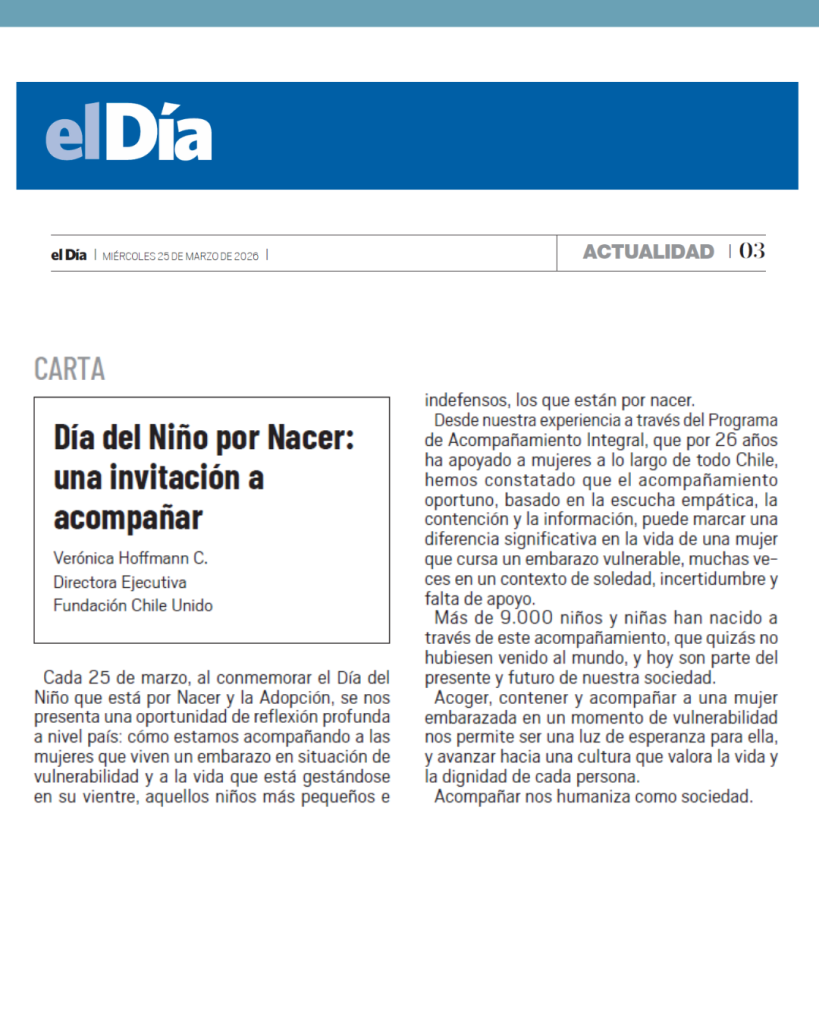 El mismo día 25 de marzo, compartimos una reflexión como Fundación Chile Unido, que fue publicada tanto por el diario La Tercera como el diario el Día de la Serena. “Día del Niño que está por Nacer: Una invitación a acompañar”, es el título de esta misiva que nos insta como sociedad a involucrarnos en el acompañamiento.