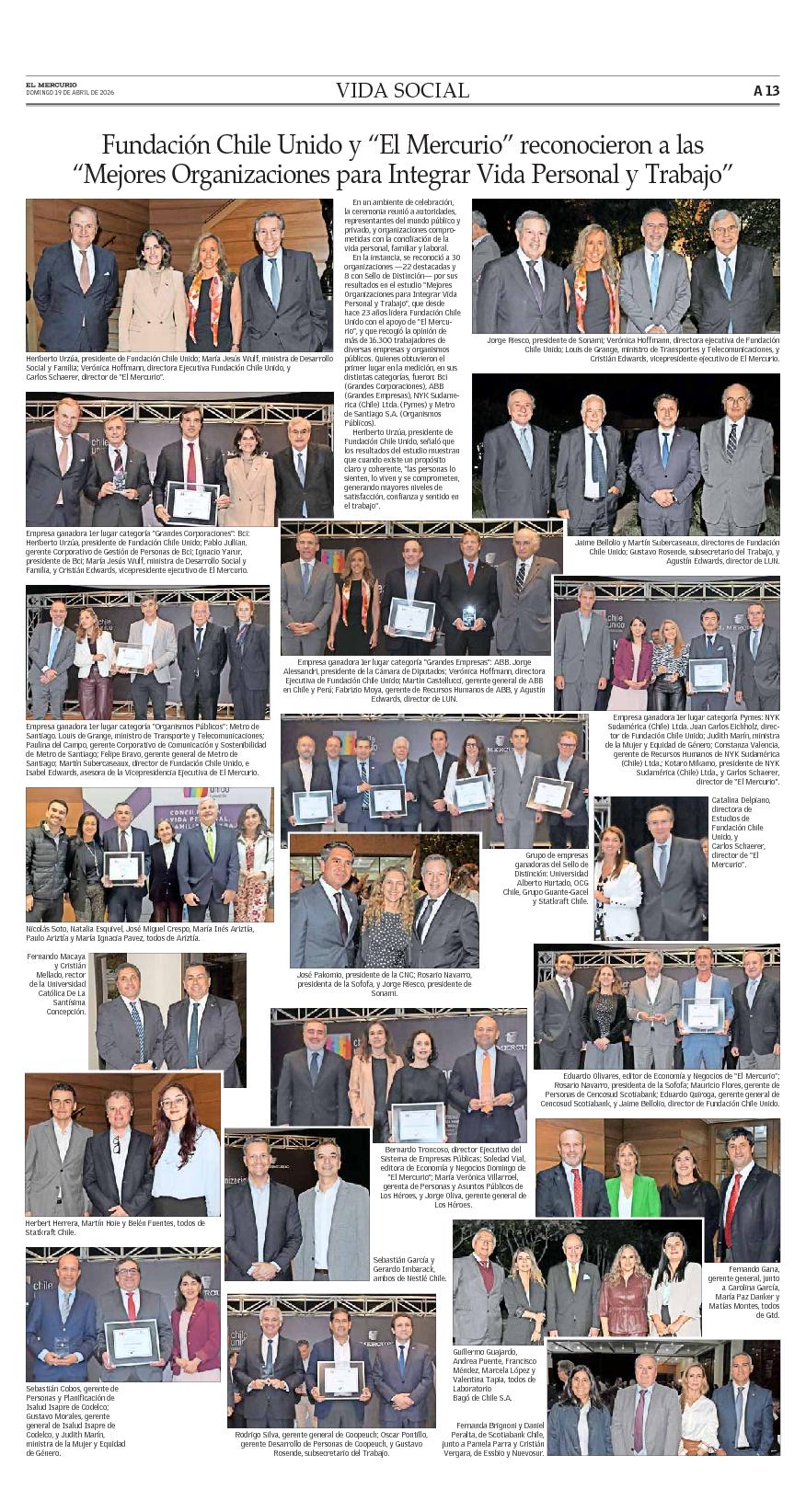 Lo invitamos a conocer con más detalle las publicaciones que se han realizado con motivo de la premiación de las Mejores Organizaciones para Integrar Vida Personal y Trabajo, como la nota de prensa de Economía y Negocios de El Mercurio, la publicación de Vida Social y la Edición Especial de la que participaron diversas empresas que hicieron parte de este Estudio.